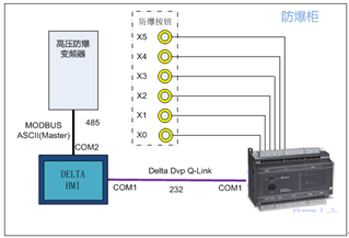 該係統主要配置包括ES2R控製器 1 台,B05S100觸摸屏1台,高壓防爆變頻器1台,6枚按鈕防爆。整個係統中,除6枚防爆按鈕安裝在防爆櫃麵板外,其餘部分都封閉於防爆櫃體內,變頻器所有操作通過6枚按鈕完成。因為處於防爆環境中,不能直接操作接觸摸屏,所以要通過PLC的6個輸入點外接防爆按鈕來代替在觸摸屏上的操作。該方案的靈活之處就是避免了操作人員直接觸摸屏,從而防止事故發生。