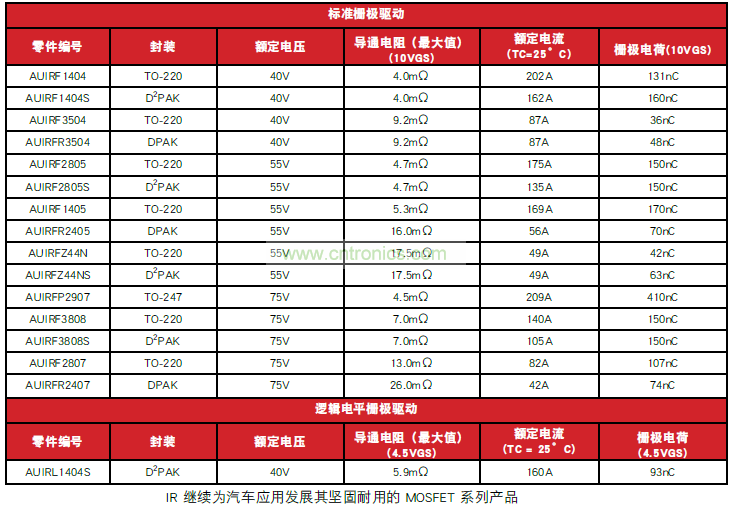 International Rectifier 的符合汽車標準的最新 MOSFET 係列具有低通態電阻和高電流處理能力,可滿足傳統內燃機(ICE) 平台以及微型和混合動力汽車平台方麵的重負載應用。