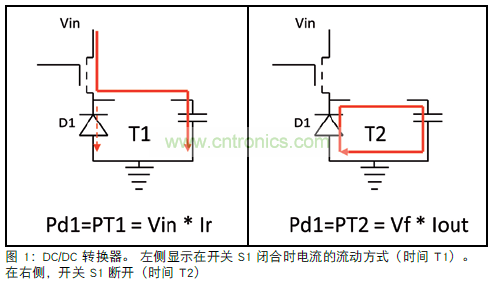 在 T1 期間,D1 處於關斷狀態;唯一流過的電流是反向電流 (Ir)。 此電流相對較低,而且主要由輸入電壓(Vin) 決定。 二極管 (PT1)的功率損耗粗略可用下式計算:Ir*Vin。