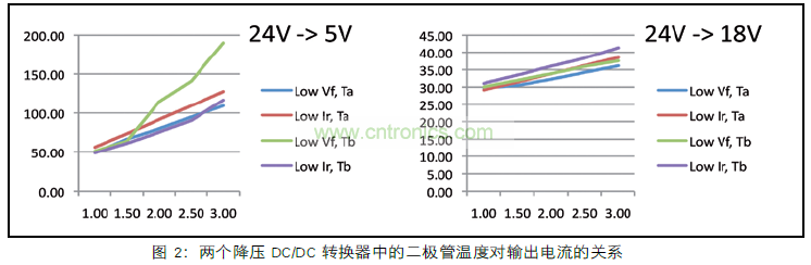 圖 2 還清楚地顯示輸入輸出電壓比。左圖顯示低占空比5 V輸出的D C / D C 轉換器。在較低的占空比時,T2的時間較長,功耗也較高。這反過來使二極管更熱,使得Ir增加地更大,因此PT1變得更高。總的結果是:在輸出電流增加時,二極管的溫度會很快地升高。在電流較高時,溫度實際上已經超過了二極管規定的工作範圍。在圖 2 的右側,較高的輸出電壓18V時,它的占空比也比較高,這使得PT2損耗保持在可控製範圍內。二極管上產生的熱量較少,使得Ir增加的幅度較小,因此,PT1會更少,並且整體溫度升高幅度較小。