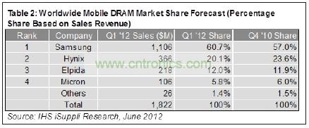 移動市場第一季度占總體DRAM營業收入的28.0%。第一季度mDRAM平均銷售價格(ASP)為1.72美元每GB,仍然高於商品類DRAM,後者價格是0.52美元每GB。但是,由於商品類DRAM價格預計下半年上漲,而mDRAM價格總體下降,所以目前移動DRAM所擁有的價格升水今年將逐漸縮小。與此同時,2012年移動DRAM營業收入將繼續增長,其比特出貨量預計下半年勁增20%以上。