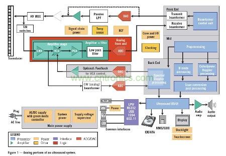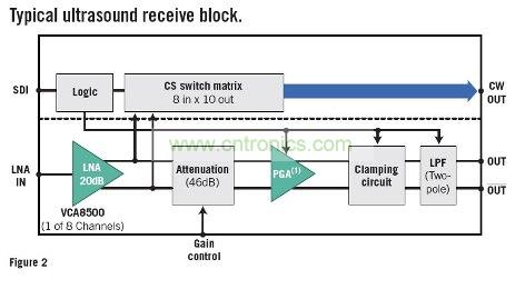 首先以超聲波設備為例來探討模擬性能需求。通過該範例,本文將介紹如何在性能、功耗、尺寸以及集成度之間進行權衡,並檢測雙極性與CMOS工藝技術的適用性。圖1是典型超聲波機器的係統方框圖,展示了傳輸與接收兩個部分。這兩個部分負責驅動傳感器與數字處理部分(未顯示),從而構成完整的超聲波設備。