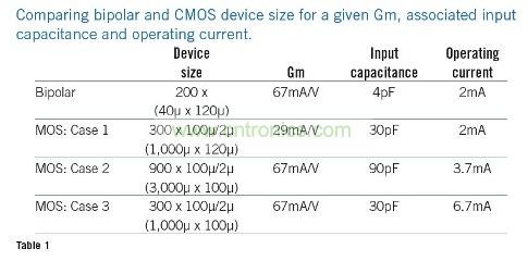 表1是用於放大器的雙極性器件和CMOS器件的尺寸比較。CMOS器qi件jian較jiao大da的de尺chi寸cun及ji伴ban隨sui的de輸shu入ru電dian容rong嚴yan重zhong限xian製zhi了le放fang大da器qi的de輸shu入ru帶dai寬kuan。在zai本ben例li中zhong,采cai用yong雙shuang極ji性xing放fang大da器qi可ke實shi現xian低di偏pian置zhi電dian流liu下xia的de低di噪zao聲sheng。但dan使shi用yong雙shuang極ji性xing器qi件jian可ke能neng會hui有you基ji電dian流liu噪zao聲sheng,而er這zhe在zaiCMOS器件中則可以忽略不計。該基電流噪聲的幅度取決於傳感器的阻抗和係統具體的實施情況。