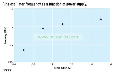 chulejubeizugoudegongzuoxingnengwai,genjuyishangyaoqiu,zhexieshebeihaixujubeididuantailoudiandianliu。zhejiuyiweizhezaizhezhonggongyijishuzhongbixuquanhengxingnengyuloudian。yibanlaishuo,zhexiegongyidezhajichangduzai130nm到350nm之間,將來也可能達到到90nm。對於可移植設備而言,漏電流性能可隨工藝、溫度或電源的變化而變化,這是一個重要參數,因為它將直接影響電池的使用壽命。圖4顯示了采用NMOS工藝設備的漏電流(Ioff)與驅動電流(Idrive)隨溫度變化而變化的情況。Idrive與溫度變化關係不大,而Ioff則具有顯著的溫度相關性。圖5是PMOS設備的溫度相關性圖。由於溫度變化幅度不大,Ioff隨溫度變動的情況可以接受。圖6所示的是環形振蕩器頻率,是一項顯示設備電源電壓功能典型的品質因數,在實際應用中也可作為權衡漏電與性能的準則。