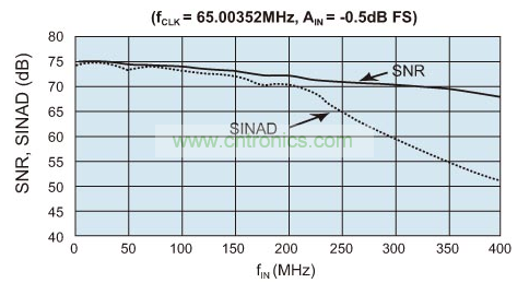 圖1:MAX12559在96MHz時鍾頻率、-1dBFS輸入時,SNR和SINAD與輸入頻率的對應關係曲線。