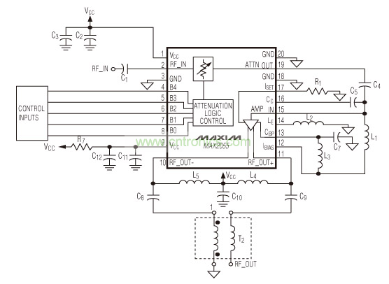 Maxim的MAX2055、MAX2027可用作MAX12559的緩衝放大器,MAX2055是一個帶寬在30~300MHz的數控可變增益放大器(圖2)。