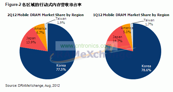 第二季行動式內存營收,三星半導體市占逼近全球60%,仍穩居龍頭之位,韓係廠商占全球行動式內存營收的77.5%,較第一季僅小幅減少1.1%。第三名的日商爾必達市占則是小幅下滑0.8%來到13.9%,美商美光科技則受惠於中低階智能型手機的成長,市占小幅成長至6.7%,位居第四。台係DRAM廠(chang)亦(yi)在(zai)行(xing)動(dong)內(nei)存(cun)市(shi)場(chang)中(zhong)試(shi)圖(tu)搶(qiang)占(zhan)一(yi)席(xi)之(zhi)地(di),除(chu)了(le)華(hua)邦(bang)電(dian)子(zi)之(zhi)外(wai),南(nan)科(ke)亦(yi)在(zai)本(ben)季(ji)營(ying)收(shou)當(dang)中(zhong)初(chu)次(ci)嶄(zhan)露(lu)頭(tou)角(jiao),目(mu)前(qian)比(bi)重(zhong)雖(sui)然(ran)不(bu)高(gao),但(dan)也(ye)為(wei)整(zheng)個(ge)行(xing)動(dong)式(shi)內(nei)存(cun)的(de)市(shi)場(chang)帶(dai)來(lai)不(bu)同(tong)的(de)氛(fen)圍(wei)。值(zhi)得(de)注(zhu)意(yi)的(de)是(shi)由(you)於(yu)下(xia)半(ban)年(nian)受(shou)到(dao)景(jing)氣(qi)不(bu)確(que)定(ding)因(yin)素(su)的(de)影(ying)響(xiang),各(ge)家(jia)內(nei)存(cun)製(zhi)造(zao)商(shang)在(zai)下(xia)半(ban)年(nian)生(sheng)產(chan)與(yu)開(kai)發(fa)的(de)計(ji)劃(hua)也(ye)逐(zhu)漸(jian)轉(zhuan)趨(qu)於(yu)保(bao)守(shou),謹(jin)慎(shen)應(ying)對(dui)自(zi)2009年以來最嚴峻的景氣寒冬。