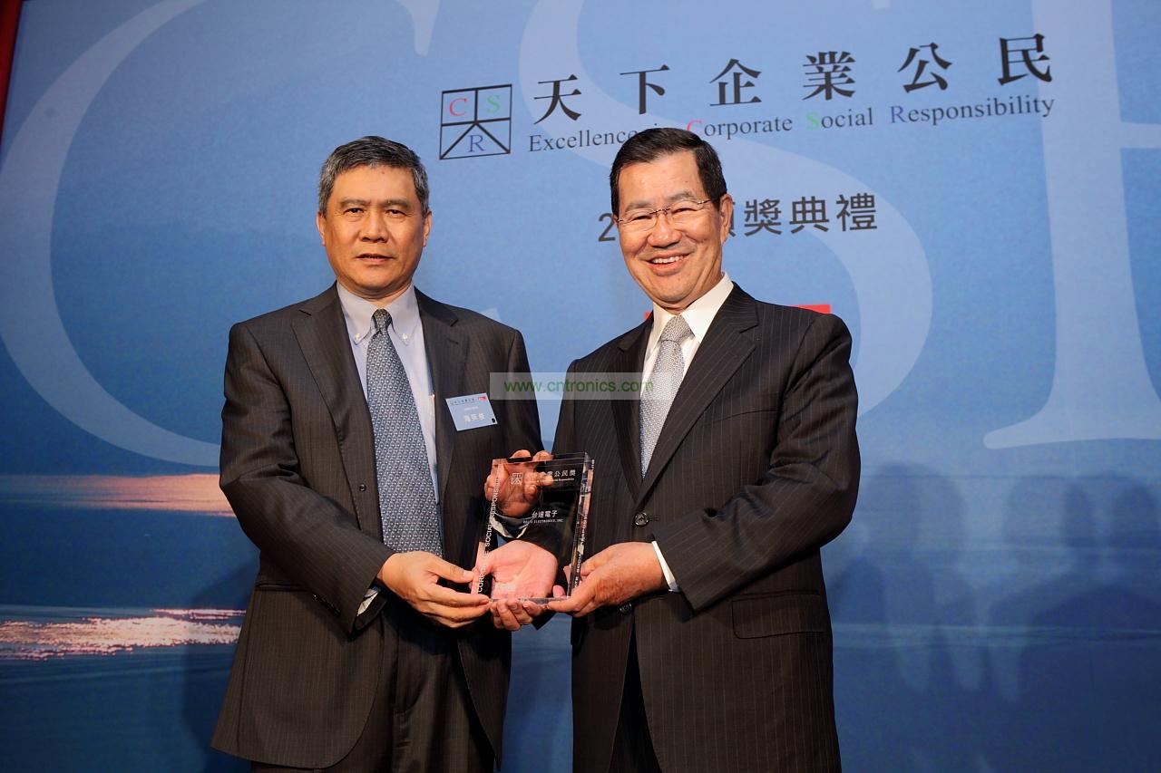 台達電子海英俊董事長(左)出席2012 天下雜誌企業公民獎頒獎典禮, 自 蕭萬長前副總統手中接過大型企業 首獎
