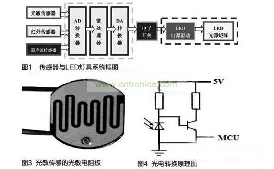傳感器作為信號采集和機電轉換的器件,其機電技術已相當成熟,近幾年MEMS(微機電係統)技術興起又將傳感器技術向小型化、智能化、多功能化、低成本化大踏步邁進。光敏傳感器、紅外傳感器等各種類型的傳感器都可與LED照明燈具組成一個智能控製係統,傳感器將采集來的各種物理量信號轉換成電信號,可以經由集成電路化的AD(模數)轉換器 、MCU(微控製器)、DA(數模)轉換器對所采集的信號進行智能化處理,從而控製LED照明燈具開啟和關閉。人類可以籍此在MCU上設定各種控製要求,控製LED燈的開關時間、亮度、顯色、多彩變幻,從而達到省電節能的目標。傳感器與LED燈具組成的係統框圖如圖1所示。目前的集成電路製造技術已經可以將AD、DA、MCU集成在一個5mm×5mm或更小的封裝內,安裝在燈具內既不占麵積而且十分方便。