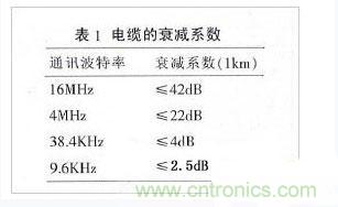 導線的電阻對信號的影響很小,可以忽略不計。電纜的分布電容C主要是由雙絞線的兩條平行導線產生。信號的損失主要是由於電纜的分布電容和分布電感組成的LC低通濾波器。通訊波特率越高,信號衰減也會越大。常規電纜的衰減係數見表1。