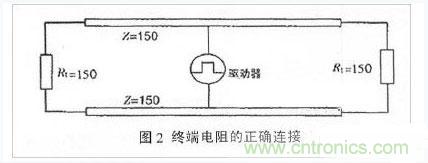 ②阻(zu)抗(kang)不(bu)連(lian)續(xu),顧(gu)名(ming)思(si)義(yi),與(yu)光(guang)從(cong)一(yi)種(zhong)媒(mei)質(zhi)進(jin)入(ru)另(ling)一(yi)種(zhong)媒(mei)質(zhi)時(shi)所(suo)引(yin)起(qi)的(de)反(fan)射(she)是(shi)相(xiang)似(si)的(de)。信(xin)號(hao)在(zai)傳(chuan)輸(shu)線(xian)末(mo)端(duan)突(tu)然(ran)遇(yu)到(dao)電(dian)纜(lan)阻(zu)抗(kang)很(hen)小(xiao)甚(shen)至(zhi)沒(mei)有(you),信(xin)號(hao)在(zai)這(zhe)個(ge)地(di)方(fang)就(jiu)會(hui)引(yin)起(qi)反(fan)射(she)。消(xiao)除(chu)這(zhe)種(zhong)反(fan)射(she)最(zui)常(chang)用(yong)的(de)方(fang)法(fa),是(shi)在(zai)電(dian)纜(lan)的(de)末(mo)端(duan)跨(kua)接(jie)一(yi)個(ge)與(yu)電(dian)纜(lan)的(de)特(te)性(xing)阻(zu)抗(kang)同(tong)樣(yang)大(da)小(xiao)的(de)終(zhong)端(duan)電(dian)阻(zu),使(shi)電(dian)纜(lan)的(de)阻(zu)抗(kang)連(lian)續(xu)。由(you)於(yu)信(xin)號(hao)在(zai)電(dian)纜(lan)上(shang)的(de)傳(chuan)輸(shu)是(shi)雙(shuang)向(xiang)的(de),因(yin)此(ci),在(zai)通(tong)訊(xun)電(dian)纜(lan)的(de)另(ling)一(yi)端(duan)同(tong)樣(yang)要(yao)跨(kua)接(jie)一(yi)個(ge)相(xiang)同(tong)大(da)小(xiao)的(de)終(zhong)端(duan)電(dian)阻(zu),如(ru)圖(tu)2所示。