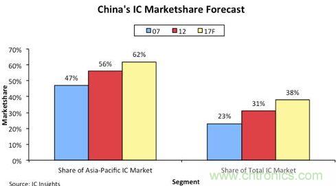 IC Insights表示,中國IC市場規模將由2014年的1000億美元,在2017年成長至1500億美元;該機構估計,在2017年,中國市場將占據全球晶片市場38%的比例。而在2007年,中國晶片市場營收占據全球晶片市場營收的比例為23%。