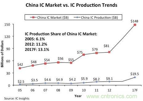 市場研究機構IC Insights的最新預測報告指出,中國IC市場可望在2012~2017年之間,以13%的複合年平均成長率(CARG)持續擴張,報告同時指出,中國IC市場持續擴張的背後,主要依靠來自外國製造商在中國地區的大規模投資建廠。