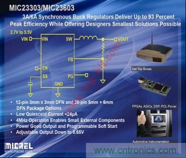 麥瑞半導體推出了采用HyperLight(R)Load技術的4MHz PWM 6A/3A同步降壓穩壓器係列產品MIC23603/303。MIC23603/303采用的專利架構提供了最高水準的瞬態性能,在全脈寬調製(PWM)模式下輸出紋波僅有5mV。MIC23603/303將低損耗的專利功率MOSFET與麥瑞半導體擁有專利的恒定導通時間直流-直流開關轉換器方案結合在一起,可提供高達6A/3A的輸出電流,同時僅消耗24μA靜態電流。MIC23603/303是驅動機頂盒、便攜式設備以及汽車儀表中的FPGA、ASIC和DSP集成電路的理想產品,在這些應用中,超快瞬態響應和輕載效率至關重要。MIC23603目前已經開始批量供應,千片訂量的價格為1.08美元/片。MIC23603的千片訂量價格為0.49美元/片。