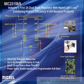 麥瑞半導體推出了兩款3MHz雙輸出2A高效降壓穩壓器MIC23158/9。得益於麥瑞半導體擁有專利的HyperLight Load®技術,這兩款集成電路為當今最苛刻的應用提供了超快的瞬態響應,包括機頂盒、針對FPGA的核心和I/O電壓、CPLD、ASIC、GPS/導航係統、PC卡、汽車儀表以及通用負載點(POL)直流-直流轉換等應用。MIC23158/9目前已經開始批量供應,千片訂量的價格分別為0.88美元/片和0.91美元/片。