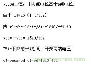 因此,在關斷過程一開始,vt立即從零上升到vcem,it在從i0下降至零期間,vt=vcem不變。直到it=0、id=i0以後,vt才下降為電源電壓vd,如圖5(b)所示。vcem超過vd的數值取決於lб、tfi和負載電流i0,顯然過快的電流下降率di/dt(即tfi小)、過大的雜散電感lб或負載電流過大都會引起關斷時元件嚴重過電壓,且伴隨著很大的功耗。
