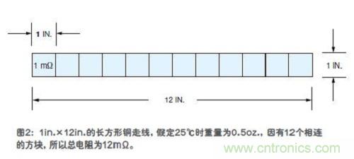 我們舉一個簡單的例子。圖2是一條長方形的銅走線,在25℃時其重量約為0.5oz.,走線寬度為1英寸,長度為12英寸。我們可以將走線分解成一係列方塊,每個方塊邊長都是1英寸。這樣,總共就有12個方塊。按照表2,每個0.5oz.重的銅箔方塊的電阻為1mΩ,現在共有12個方塊,因此走線的總電阻為12mΩ。