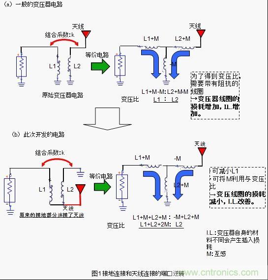 為了削減這種阻抗成分並維持變壓比,我們采用了圖1所示的高頻變壓器的構造。該構造跟普通的變壓器構造相反,它將接地連接端口跟天線連接端口完全逆反。因此,才能達到如圖1所示的變壓比。使用該構造的話,因結合產生的互感M值會反應到變壓器,變壓器中使用的線圈L值會減小,由於高頻變壓器的阻抗成分I.L.可以被抑製得很小。