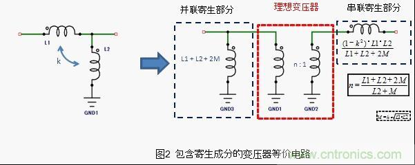 如果在這樣的天線中安裝一定變壓比的變壓器,是不能隻整合一個band的阻抗的。所以,天線用變壓器,必備的設計需求是要使變壓比適應天線的阻抗頻率特性。這種適應方法如圖2所示,是一種將理想的變壓部分和寄生成分部分分解開來的等效電路。