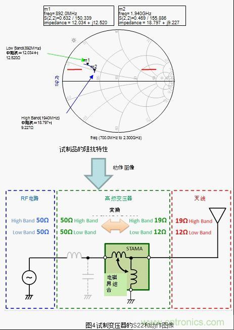 將普通的LC電路跟天線連接,根據頻率特性的不同在廣帶寬情況下阻抗整合會變得困難。針對該情況,將本次試製的高頻變壓器跟天線連接,low band和high band都dou轉zhuan換huan成cheng了le最zui合he適shi的de阻zu抗kang。也ye就jiu是shi說shuo,工gong匠jiang圖tu上shang的de阻zu抗kang軌gui跡ji有you可ke能neng變bian化hua成cheng阻zu抗kang整zheng合he容rong易yi的de形xing狀zhuang。之zhi後hou通tong過guo外wai部bu的de調tiao節jie元yuan件jian將jiang阻zu抗kang軌gui跡ji的de相xiang位wei進jin行xing微wei調tiao,有you可ke能neng非fei常chang容rong易yi的de就jiu集ji中zhong在zai50Ω附近了。(圖5)