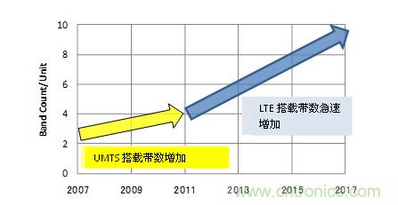3G技術隻是一種上行和下行達到數Mbps程度的速度,但是LTE卻以上行50Mbps以上,下行100Mbps以上的速度,達到了與固定通信網絡速度相同的目標。GSM/UMTS對應終端中,通常都是GSM搭載4個,UMTS搭載2-4個頻帶,如果要對應LTE的話還會再追加1-2個頻帶。圖1是移動設備中搭載的平均頻帶數的推測圖。網絡上的通信量增大的同時,保證了通信容量、通信頻率,LTE頻帶的搭載數量預測也將迅速增加。