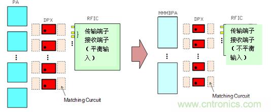 移動終端的前端部分搭載的電子元器件隨著通信功能的混載和搭載頻帶數量的增加,正在日漸小型化。在構成無線通信設備的同時,RF收發器IC(RFIC;射頻集成電路)是必備的元器件。RFIC具有變化電波頻率、調節和調整信號功能。RFIC的接收端輸入端子的趨勢是由平衡輸入轉化成不平衡輸入,通過實現不平衡輸入的信號處理來達到削減RFIC端子數量的小型化目的。另外,PA的信號強度增加,采用了MMMB(多模多頻段)PA。如果隻用對應一個頻帶的PA構成的話,那隻搭載頻帶數的PA就變得非常必要了,MMMBPA對應的是多波段,一個元器件就能覆蓋多個的頻帶。如果使用這個的話,可以通過減少元器件個數來實現縮小搭載麵積的目的。電感器、電容這種匹配的元件也不例外,可以推進從0603尺寸(0.6×0.3mm)到0402尺寸(0.4×0.2mm)的小型化。