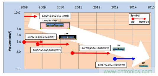 圖4所示是村田SAW雙工器產品尺寸的變遷。從舊的空腔3025尺寸(3.0×2.5mm),到後來通過確立樹脂封止方法將CSP型號成功產品化,實現了小型化。再後來,通過改善電極設計和加工技術,繼續完善對小型化的完善。於是,2013年成功地將1814尺寸 (1.8×1.4mm)的CSP型號SAW雙工器產品化。它比現在主流的2016尺寸(2.0×1.6mm)還要再減少20%的搭載麵積,成為了支撐今後搭載頻帶數量增加的新技術。
