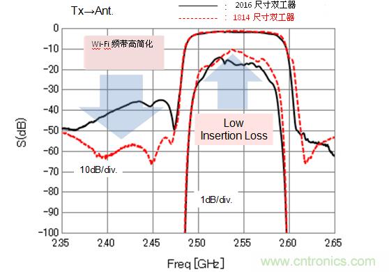 圖5所示為Band7用的2016尺寸和1814尺寸的雙工器的傳輸端特性比較。為了跟Wi-Fi係統共存,必須在Wi-Fi頻帶中進行高減衰的Band7雙工器2016尺寸的基礎上進行了改善。傳輸端的傳送特性是在Wi-Fi頻帶中進行高減衰、實現了Band7傳輸頻帶的低插入損耗的目標。雖然受到了1814尺寸小型化設計自由度的限製,我們還是注重了電極設計的舒適化、同時在芯片布局上花了足夠的心思,所以Band7的特性超越了2016尺寸。