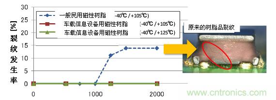 熱衝擊投入周期數和裂紋發生率的關係如圖3所示。一般民用市場的磁性樹脂在1000輪以下就會產生裂紋,而我們開發的車載信息設備用磁性樹脂在2000輪之後仍然沒有產生裂紋。並且確保即使在更嚴厲的-40℃⇔+125℃環境下的熱衝擊試驗中也不會產生裂紋。