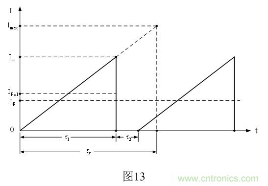 這裏順便介紹一下電流平均值Ip的求法,以及其與最大電流Im和極限電流Imax的關係。圖13是電流平均值Ip與最大電流Im和極限電流Imax之間的關係圖。