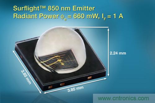 【導讀】日前,Vishay推出新款850 nm紅外發射器,它的尺寸為3.85mm x 3.85mm x 2.24mm的器件采用頂視SMD封裝,在1A下的發光強度為350mW/sr,光功率達660mW,熱阻低至10K/W。新款發射器適用於CCTV、遊戲和公路收費係統中的紅外照明,以及長距離的測距應用。