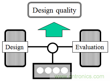 西森久雄在總結時表示:“通過提供來自T3Ster測(ce)量(liang)結(jie)果(guo)的(de)結(jie)構(gou)函(han)數(shu),與(yu)設(she)計(ji)值(zhi)的(de)比(bi)較(jiao)和(he)驗(yan)證(zheng)可(ke)以(yi)更(geng)詳(xiang)細(xi)的(de)進(jin)行(xing)。在(zai)可(ke)靠(kao)性(xing)測(ce)試(shi)中(zhong)使(shi)用(yong)這(zhe)個(ge)測(ce)量(liang)方(fang)法(fa)已(yi)經(jing)幫(bang)助(zhu)我(wo)們(men)發(fa)現(xian)影(ying)響(xiang)壽(shou)命(ming)的(de)設(she)計(ji)缺(que)陷(xian),而(er)且(qie)由(you)於(yu)設(she)計(ji)值(zhi)現(xian)在(zai)能(neng)夠(gou)測(ce)量(liang)出(chu)來(lai),因(yin)此(ci)進(jin)行(xing)前(qian)端(duan)裝(zhuang)載(zai)成(cheng)為(wei)可(ke)能(neng)。此(ci)外(wai),我(wo)們(men)還(hai)可(ke)以(yi)通(tong)過(guo)降(jiang)低(di)設(she)計(ji)中(zhong)的(de)重(zhong)複(fu)工(gong)作(zuo)以(yi)降(jiang)低(di)原(yuan)型(xing)成(cheng)本(ben)。”(圖 3)西森久雄通過一個汽車隱喻很好地表達了他對設計和評估過程的觀點:“評估和設計就像質量保證的兩個‘輪子’,重要的‘發動機’則為輪子提供驅動力。通過適當地組合 CAD、CAE 和自動化測量,輪子將把‘優質的設計’帶到路上。”(圖4)