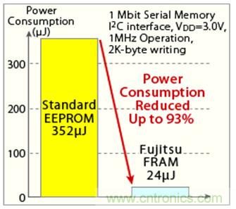圖3:EEPROM和富士通半導體FRAM產品之數據寫入作業功耗比較