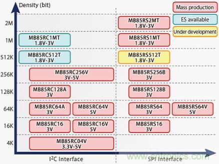 MB85RC1MT的出現增加了富士通半導體的FRAM產品陣容:I2C 接口(支持4 Kb至1 Mb內存容量)和SPI接口(16 Kb至2 Mb內存容量)(如圖4)。這些FRAM產品采用業界標準的8針腳SOP封裝,因而可取代EEPROM或序列閃存,並適用於工廠自動化、測試儀器及工業設備等應用,更無須大幅修改電路版的設計。