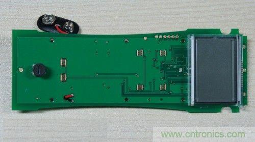 翻轉板卡,另一麵的電路就更少了,除了一個段式的LCD模塊,以及幾個功能按鍵(黑色旋鈕為校準溫度的變阻器),就沒什麼東西了,有意思的是段式LCD模塊與PCB板的連接方式。