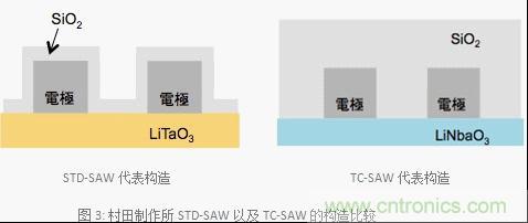 圖3是村田製作所STD-SAW以及TC-SAW構造的示意圖。SAW雙工器的頻率溫度依賴性是由於使用了壓電電路板造成的。此外,STD-SAW、TC-SAW都是因為使用的壓電電路板具有頻率溫度依賴性的相同特點。如圖3所示,TC-SAW最具代表性的特征之一是整塊電路板跟STD-SAW相比它的表麵覆蓋了一層很厚的二氧化矽(SiO2)。壓電電路板的溫度上升的話頻率就會降低,那麼頻率溫度係數就會變成負值。另外,SiO2具備正頻率溫度係數的特點。因此,和STD-SAW相比的話由於覆蓋了一層厚SiO2的獨特構造,SiO2的正頻率溫度係數的影響會變大,那麼SAW雙工器與STD-SAW相比就實現了抑製頻率溫度依賴性的特點。STD-SAW的保護膜SiO2具有強大的特質,如果覆蓋了像TC-SAW一樣厚的SiO2的話就不能保證帶寬,同時也不能獲得優良的特性。因此,TC-SAW將電路板的材料從LiTaO3變成了LiNbaO3,才能夠確保必要的帶寬。此外,TC-SAW的LiNbaO3的切割角發生了變化使得頻率選擇性變得可控製,村田製作所運用了對應項目的必要特性設計了符合市場需求的最佳切割角。