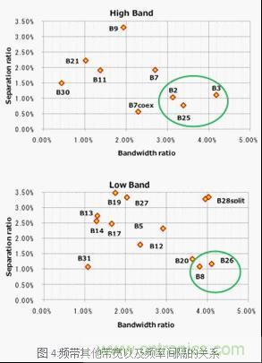 雙工器的設計根據Third Generation Partnership Project (3GPP)的規格根據頻帶的送信和收信帶寬以及送信端和收信端的頻率間隔(Separation ratio)決定了其難易度。一般來說頻率的帶寬越廣那麼送信端和收信端的頻率間隔越小難易度就越高。總結兩者的關係來看,如圖4。村田製作所正致力於圖4中圈出的部分,計劃優先實現TC-SAW對應的產品。