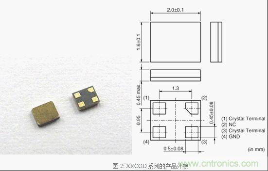 XRCGD係列的產品外觀如圖2所示。產品規格如表1所示。采用了2.0×1.6mm的外形尺寸,相對於目前民生市場上一般的3225尺寸(3.2×2.5mm)達到了削減60%的小型化。對應頻率通過無線通信在主要的各種頻率上疊加,可對應麵向智能手機等廣泛采用高智能CPU的頻率。頻率精度將初期偏差、溫度特性和長期變化計算在內全部的頻率精度在±20ppm以下。主要預計應用於Wi-Fi、Bluetooth® 等無線通信以外、智能手機和可穿戴設備等高智能CPU中。