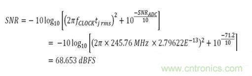 現在,通過計算得到了所有必須的要素,但依然缺少最後一個公式。 需要計算此抖動對AD9643的SNR產生的影響。 現在來看看這個公式是什麼,然後代入已知數。已知時鍾頻率和rms抖動。 從AD9643數據手冊中可以得到140 MHz模擬輸入頻率下的SNR等於71.4 dBFS。 使用公式,可以看到結果為: