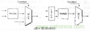 這 是shi一yi種zhong在zai塊kuai輸shu出chu不bu用yong時shi防fang止zhi輸shu入ru信xin號hao使shi塊kuai開kai關guan工gong作zuo的de技ji巧qiao。例li如ru考kao慮lv一yi個ge乘cheng法fa器qi,它ta的de輸shu出chu僅jin在zai某mou些xie特te定ding條tiao件jian下xia才cai使shi用yong。在zai此ci場chang合he可ke增zeng添tian一yi個ge鎖suo存cun器qi,這zhe樣yang每mei當dang輸shu出chu 不用時,乘法器的輸入將阻止不必要的開關動作帶入乘法器(圖4)。一個鎖存器隻需一個組合單元,並不占用過多芯片麵積。