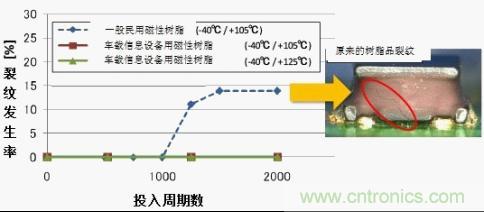 熱衝擊試驗投入的循環數和開裂發生率的關係如圖3所示。可以得知,與麵向一般民用市場的磁性樹脂在1000次循環試驗以內會發生開裂相比,我們開發出的用於車載信息設備的磁性樹脂在2000次循環之後仍未發生開裂現象。並且,已經確認在更為嚴酷的環境下---40℃↔+125℃中進行的熱衝擊試驗也沒有發生開裂現象。