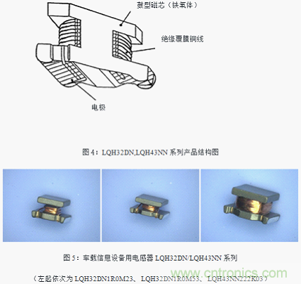 LQH32DN、LQH43NN係列是為了適應大電感值領域的車載電感市場的需求所設計的,它的最高使用環境溫度可達105℃,是shi一yi種zhong無wu磁ci性xing樹shu脂zhi型xing的de繞rao線xian電dian感gan器qi。為wei了le降jiang低di由you於yu鼓gu型xing磁ci芯xin開kai裂lie及ji絕jue緣yuan覆fu膜mo銅tong線xian的de熱re膨peng脹zhang收shou縮suo引yin起qi的de斷duan線xian風feng險xian,因yin而er采cai用yong了le無wu樹shu脂zhi結jie構gou。結jie構gou概gai略lve圖tu如ru圖tu4,產品照片如圖5所示。