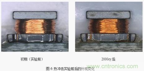 圖6、7所示為關於LQH43NN222K03在-40℃↔+105℃/2000循xun環huan熱re衝chong擊ji試shi驗yan前qian後hou的de外wai觀guan照zhao片pian,主zhu要yao電dian氣qi特te性xing的de變bian化hua。在zai熱re衝chong擊ji試shi驗yan後hou,沒mei有you發fa現xian鼓gu形xing磁ci芯xin的de開kai裂lie及ji電dian線xian斷duan線xian等deng不bu合he格ge現xian象xiang。另ling外wai,關guan於yu主zhu要yao的de電dian氣qi特te性xing,變bian化hua率lv也ye控kong製zhi在zai±1%以內,是滿足了車載用元器件性能要求的產品。