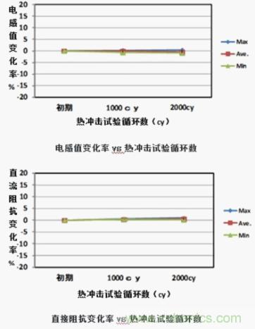 作zuo為wei支zhi持chi高gao規gui格ge可ke靠kao性xing要yao求qiu的de設she計ji案an例li之zhi一yi,我wo們men可ke列lie舉ju出chu它ta在zai高gao強qiang度du的de熱re衝chong擊ji下xia完wan成cheng試shi驗yan的de優you秀xiu的de結jie構gou設she計ji。對dui於yu車che載zai元yuan器qi件jian來lai說shuo,要yao求qiu必bi須xu在zai最zui低di使shi用yong溫wen度du與yu最zui高gao使shi用yong溫wen度du之zhi間jian進jin行xing1000次循環熱衝擊試驗。其中,用於車載信息設備的(電感器)的一般規格為-40℃↔+105℃,必須在這個溫度條件下進行1000次循環熱衝擊試驗。降低電感器的各個元器件的熱膨脹係數差是完成熱衝擊試驗的重點。