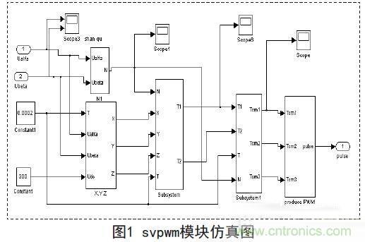 PlDkongzhiyouhenqiangdeshengmingli,taduiyudaduoshuguochengdoujuyoulianghaodekongzhixiaoguohelubangxing,erqiesuanfayuanlijianming,canshuwuliyiyimingque,lilunfenxitixiwanzhengqieyingyongjingyanfengfu。yincizhenduixitongzhongdeyizhiganraotexingzheyifangmiandeyaoqiukeyicaiyongPID控製器。對單電機的控製采用雙閉環設計,通過svpwm進行調速,使係統具有良好的穩定性,svpwm調速模塊仿真圖如圖1所示。然後將兩台電機反饋回來的轉速差作差,再通過PID調節作為當負載有變化時的轉速反饋額外補償。係統仿真模型如圖2所示。