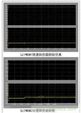 PMSM1轉速受到PMSM2負載改變的影響,出現微小的下降,然後快速恢複穩定,轉矩也出現微小的波動後迅速恢複穩定。說明基於svpwm調速的PID雙閉環控製係統有較強的魯棒性,雙電機間偏差耦合補償策略當某一電機負載改變時,另一個電機有良好的跟隨性能。
