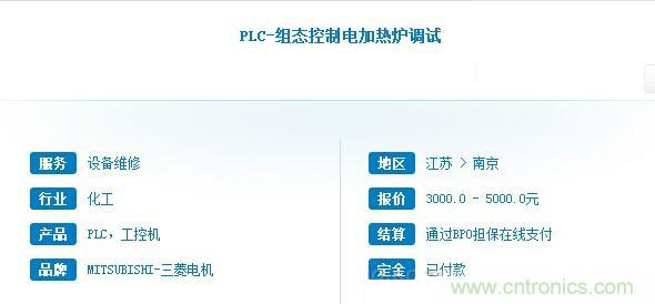 該項目由電加熱爐設備製造商發起,為該企業某型號的電加熱爐提供電氣控製開發,具體由PLC作為控製主體,結合工藝需求完成編程和組態設計,後期完成儀表接線和調試工作,工作周期30天。該活兒經過3天發布後,接到17名工程師的投標方案,最終由周邊某市的一名gongkongBPO工程師承接完成。