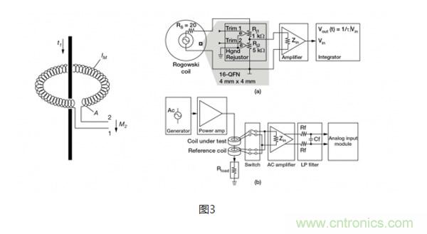 羅氏線圈(圖3)類(lei)似(si)於(yu)電(dian)流(liu)互(hu)感(gan)器(qi),會(hui)在(zai)次(ci)級(ji)線(xian)圈(quan)內(nei)會(hui)感(gan)應(ying)產(chan)生(sheng)一(yi)個(ge)電(dian)壓(ya),電(dian)壓(ya)大(da)小(xiao)與(yu)流(liu)經(jing)隔(ge)離(li)電(dian)感(gan)器(qi)的(de)電(dian)流(liu)程(cheng)正(zheng)比(bi)。特(te)殊(shu)之(zhi)處(chu)在(zai)於(yu),羅(luo)氏(shi)線(xian)圈(quan)采(cai)用(yong)的(de)是(shi)氣(qi)芯(xin)設(she)計(ji),這(zhe)一(yi)點(dian)與(yu)依(yi)賴(lai)層(ceng)壓(ya)鋼(gang)等(deng)高(gao)磁(ci)導(dao)率(lv)鐵(tie)芯(xin)和(he)次(ci)級(ji)繞(rao)組(zu)磁(ci)耦(ou)合(he)的(de)電(dian)流(liu)互(hu)感(gan)器(qi)完(wan)全(quan)不(bu)同(tong)。氣(qi)芯(xin)設(she)計(ji)的(de)電(dian)感(gan)較(jiao)小(xiao),有(you)更(geng)快(kuai)的(de)信(xin)號(hao)響(xiang)應(ying)和(he)非(fei)常(chang)線(xian)性(xing)的(de)信(xin)號(hao)電(dian)壓(ya)。由(you)於(yu)采(cai)用(yong)了(le)這(zhe)種(zhong)設(she)計(ji),羅(luo)氏(shi)線(xian)圈(quan)經(jing)常(chang)被(bei)用(yong)在(zai)像(xiang)手(shou)持(chi)電(dian)表(biao)這(zhe)樣(yang)的(de)已(yi)有(you)接(jie)線(xian)上(shang),臨(lin)時(shi)性(xing)地(di)測(ce)量(liang)電(dian)流(liu),可(ke)以(yi)認(ren)為(wei)是(shi)電(dian)流(liu)互(hu)感(gan)器(qi)的(de)低(di)成(cheng)本(ben)替(ti)代(dai)方(fang)案(an)。