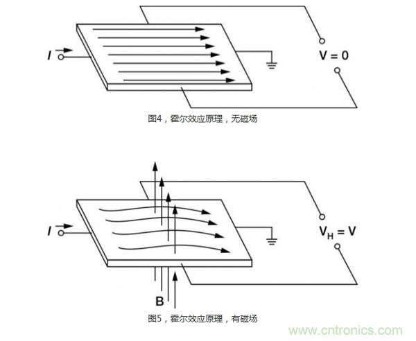 當一個帶電流的導體被放進磁場裏時(圖4),在垂直於磁場和電流流動方向上會產生電位差。這個電位與電流大小成正比。在沒有磁場和電流流過時,就沒有電位差。但如圖5所示,當有磁場和電流流過時,電荷與磁場相互作用,引起電流分布發生變化,這樣就產生了霍爾電壓。