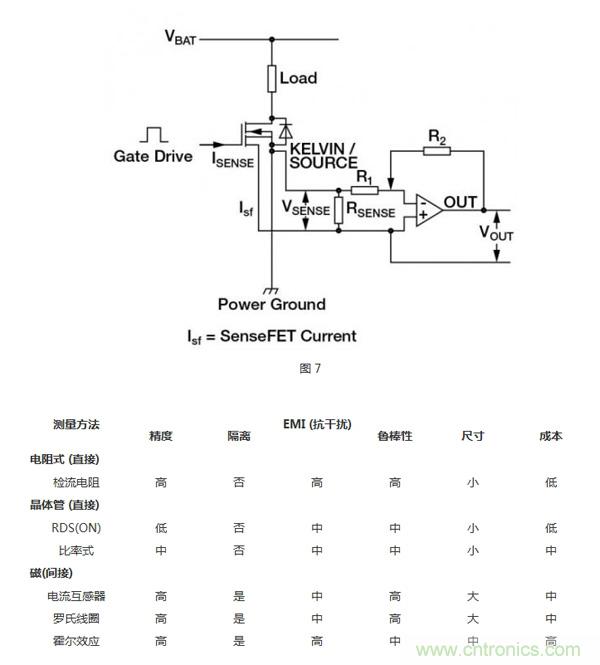 MOSFET由成千上萬個能降低導通電阻的並聯的晶體管元胞構成。檢流MOSFET使用一少部分並聯元胞,連到共柵極和漏極,但源極是分開的(圖7)。這樣就產生了第2個隔離的晶體管,即“檢測”晶體管。當晶體管導通時,流經檢測晶體管的電流與流經其他元胞的主電流成一定比例。